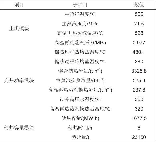 結(jié)合工程實(shí)際和前述理論分析,百兆瓦級(jí)熔鹽儲(chǔ)能技術(shù)選定技術(shù)參數(shù)見表1。儲(chǔ)熱容量指熔鹽儲(chǔ)能系統(tǒng)設(shè)計(jì)儲(chǔ)存熱量,由充熱功率和充熱時(shí)長決定。其中,充熱時(shí)長取火電機(jī)組供熱季常見的調(diào)峰時(shí)長6 h。充熱功率為主機(jī)模塊中鍋爐熱功率與汽輪機(jī)所需蒸汽熱功率差值,則本例充熱功率為279.6 MW。故熔鹽儲(chǔ)能系統(tǒng)設(shè)計(jì)儲(chǔ)熱量為1677.5 MW·h。
