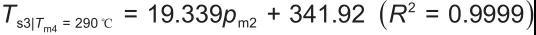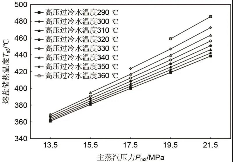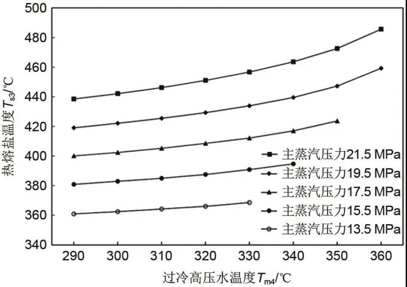 計(jì)算選取的主蒸汽壓力范圍是13.5 MPa≤p≤21.5 MPa,該壓力范圍對(duì)應(yīng)的蒸汽飽和溫度范圍是333.8~371.8 ℃,可保證主蒸汽冷凝放出大量熱被冷熔鹽(280 ℃)吸收。由圖3可知,隨著主蒸汽壓力(pm2)的增大,熔鹽儲(chǔ)熱過程熱熔鹽溫度(Ts3)也逐漸提高,且兩者近似呈線型關(guān)系。以過冷高壓水溫度(Tm4)290 ℃為例,兩者關(guān)系為