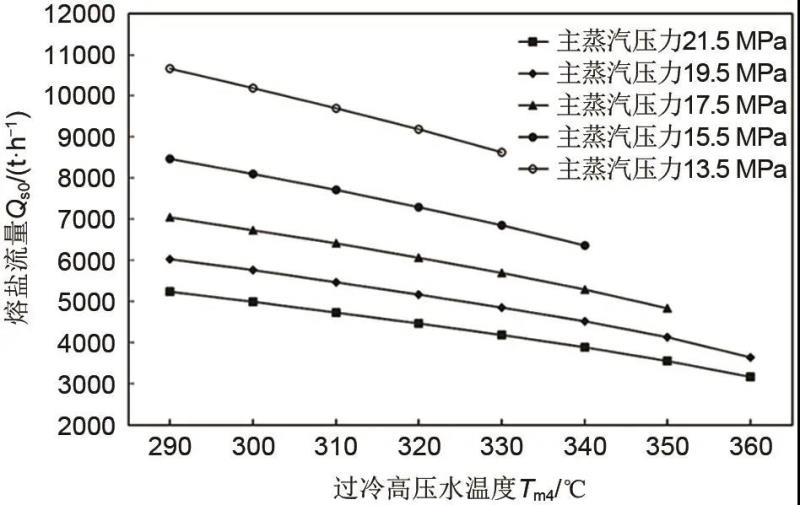進(jìn)一步分析圖5和圖6可知,最小熔鹽流量(Qs0)和最大熱熔鹽溫度(Ts3)均出現(xiàn)在過冷高壓水的溫度Tm4=360 ℃條件下,故儲(chǔ)熱過程理論上應(yīng)盡量提高過冷高壓水的溫度(Tm4)才能降低儲(chǔ)熱成本,但實(shí)際上過冷高壓水的溫度過高(Tm4>360 ℃)會(huì)造成數(shù)個(gè)換熱器處于水的臨界點(diǎn)附近換熱,由于此時(shí)水的熱物性參數(shù)波動(dòng)較大,導(dǎo)致?lián)Q熱器制造困難或者成本增大。此外,較高溫度的過冷高壓水(Tm4>360 ℃)與主機(jī)模塊高加加熱器出口給水混合后,可能導(dǎo)致鍋爐省煤器入口給水接近飽和態(tài),容易造成省煤器內(nèi)給水汽化問題,影響鍋爐安全性。故本方案熔鹽儲(chǔ)熱過程中,過冷高壓水溫度(Tm4)宜取360 ℃。