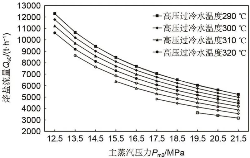 熔鹽儲(chǔ)熱為顯熱儲(chǔ)熱,在充熱功率和充熱時(shí)長確定的條件下,熔鹽使用量取決于熔鹽流量(Qs0)和熔鹽儲(chǔ)熱過程溫差(?T=Ts3-Ts1)。如前所述,受限于熔鹽安全使用溫度范圍,熔鹽儲(chǔ)熱過程冷熔鹽溫度(Ts1)設(shè)計(jì)為280 ℃,夾點(diǎn)溫差5 ℃,假定主蒸汽換熱后的溫度,即過冷高壓水溫度,和再熱蒸汽換熱后的溫度相同,即Tm4=Tr2。則熔鹽儲(chǔ)熱過程熱熔鹽溫度(Ts3)和熔鹽流量(Qs0)隨主蒸汽壓力(pm2)的變化關(guān)系分別如圖3和圖4所示。