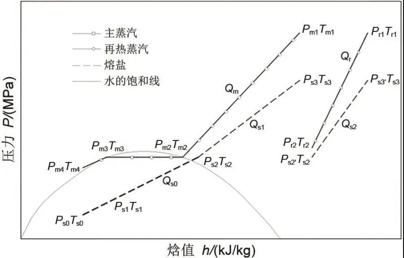 由圖2和熱質(zhì)平衡方程可知,儲(chǔ)熱換熱過程中,受限于熔鹽凝固溫度,主蒸汽和再熱蒸汽換熱后的溫度(Tm4、Tr2)不能低于凝固風(fēng)險(xiǎn)溫度,主蒸汽和熔鹽換熱夾點(diǎn)溫差的上端溫度(Tm2)取決于主蒸汽壓力(pm2),熔鹽儲(chǔ)熱過程的熱熔鹽溫度(Ts3)取決于主蒸汽和再熱蒸汽的最高溫度(Tm1、Tr1)和熔鹽流量(Qs1、Qs2)。