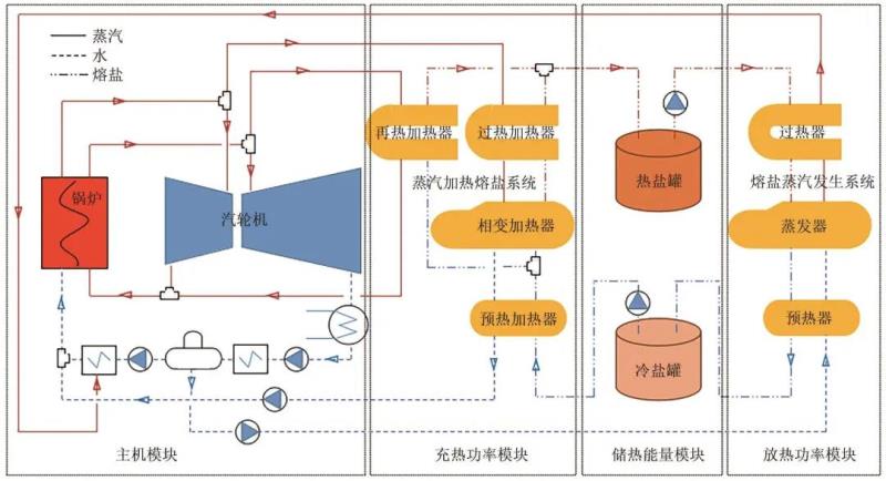 熔鹽儲(chǔ)熱目前主要用于太陽能熱發(fā)電的大規(guī)模儲(chǔ)熱系統(tǒng)中,具有較好的經(jīng)濟(jì)性。范慶偉等提出基于儲(chǔ)熱過程的工業(yè)供汽機(jī)組熱電解耦方案,在火電機(jī)組正常運(yùn)行時(shí)抽取主蒸汽/高溫再熱蒸汽儲(chǔ)熱,在供汽高負(fù)荷時(shí)熔鹽放熱,實(shí)現(xiàn)熱電解耦。鹿院衛(wèi)等公開一種火電廠深度調(diào)峰裝置專利,分別抽取鍋爐主蒸汽、鍋爐高溫再熱蒸汽、汽輪機(jī)級(jí)間再熱蒸汽進(jìn)行儲(chǔ)熱,實(shí)現(xiàn)火電機(jī)組靈活調(diào)峰。時(shí)正海等公開一種鍋爐高溫?zé)煔馊埯}儲(chǔ)熱裝置及其工作方法專利,利用鍋爐高溫?zé)煔饧訜崛埯}儲(chǔ)熱,實(shí)現(xiàn)火電機(jī)組靈活調(diào)峰。當(dāng)前熔鹽儲(chǔ)熱技術(shù)受限于鍋爐再熱器超溫問題,只能在火電機(jī)組正常運(yùn)行時(shí)儲(chǔ)熱,不能在深度調(diào)峰低負(fù)荷工況下儲(chǔ)熱,調(diào)峰能力有限。