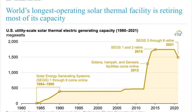 據(jù)美國(guó)能源信息署(EIA)網(wǎng)站消息,加利福尼亞州莫哈韋沙漠的太陽(yáng)能發(fā)電系統(tǒng)(SEGS)于2021年7月退役了五座太陽(yáng)能光熱發(fā)電廠(SEGS 3至7),于2021年9月退役第六座光熱太陽(yáng)能發(fā)電廠(SEGS 8)。SEGS 8退役后,SEGS中只有一臺(tái)太陽(yáng)能光熱機(jī)組將繼續(xù)運(yùn)行(SEGS 9)。SEGS于1984年開始運(yùn)行,是世界上運(yùn)行時(shí)間最長(zhǎng)的太陽(yáng)能光熱發(fā)電設(shè)施。