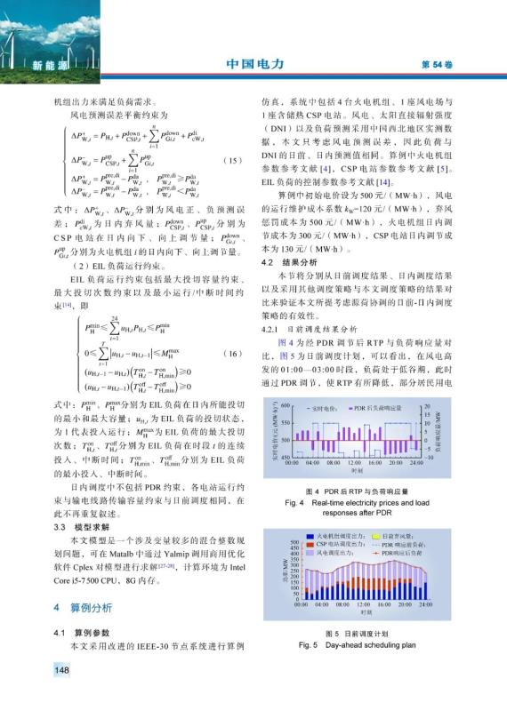 (2)居民用電負(fù)荷響應(yīng)速度慢,可以在日前調(diào)度中通過(guò)PDR制定合理RTP來(lái)調(diào)節(jié)居民用電計(jì)劃;而EIL負(fù)荷響應(yīng)速度快,可以在日內(nèi)調(diào)度中通過(guò)投切EIL負(fù)荷來(lái)促進(jìn)系統(tǒng)風(fēng)電消納。通過(guò)在日前、日內(nèi)不同時(shí)間階段利用負(fù)荷側(cè)資源的不同響應(yīng)速度,能夠有效減少系統(tǒng)棄風(fēng)量。