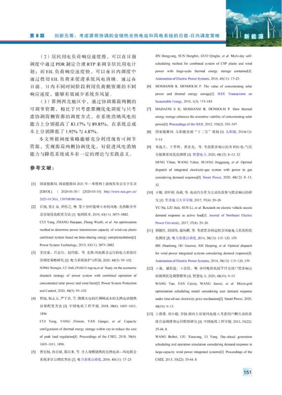 劉新元, 程雪婷, 薄利明, 等. 考慮源荷協(xié)調(diào)的含儲(chǔ)熱光熱電站和風(fēng)電系統(tǒng)的日前-日內(nèi)調(diào)度策略[J]. 中國(guó)電力, 2021, 54(8): 144-153.