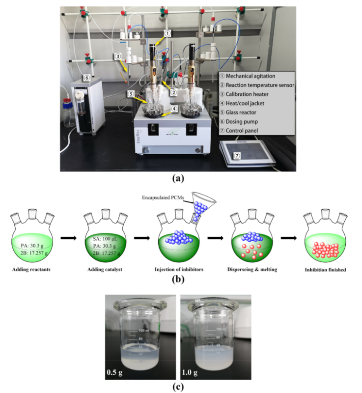 圖2 (a) 實驗裝置,(b) 抑制實驗過程,(c)膠囊化相變材料漿體