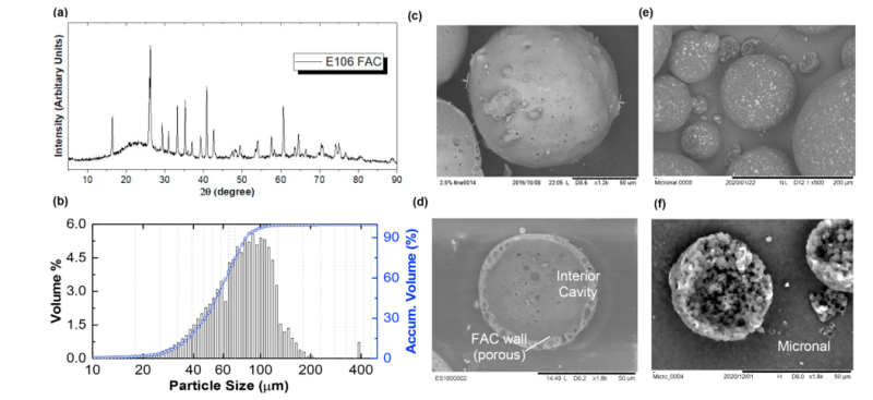圖1 用于微膠囊化的空心粉煤灰微珠(FAC)和微米級MEPCM的性能: (a) X射線衍射(XRD);(b) 粒度分布;(c) FAC表面形貌掃描電鏡圖像;(d) FAC的多孔壁結構 (e) 微粒團 (f)單個顆粒的放大圖