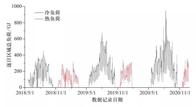 在本項(xiàng)目投產(chǎn)運(yùn)行后,出于運(yùn)營管理的需要,能源站利用其機(jī)房的節(jié)能控制系統(tǒng)對供能過程中的部分關(guān)鍵數(shù)據(jù)(冷熱水干管的流量、供回水的溫差)進(jìn)行計(jì)量。在實(shí)際操作中,是由工作人員在每日固定時段執(zhí)行“抄表”操作來實(shí)現(xiàn)數(shù)據(jù)計(jì)量工作的,記錄從上一個“抄表”時刻到當(dāng)前時刻能源站供給的累計(jì)冷熱量,相當(dāng)于記錄了區(qū)域內(nèi)建筑群的逐日總冷熱負(fù)荷。如圖3所示,已記錄數(shù)據(jù)涵蓋了從項(xiàng)目開始投產(chǎn)(2018年5月)至2021年1月的全部供能系統(tǒng)運(yùn)行日(即系統(tǒng)進(jìn)行檢修的時段除外)的實(shí)際冷熱負(fù)荷。