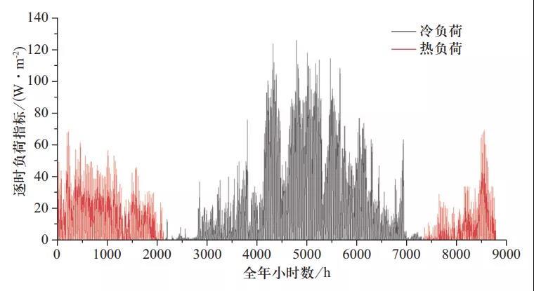 通過在全年尺度上的模擬計(jì)算,能夠得到各類型建筑逐小時的單位面積冷熱負(fù)荷指標(biāo)。根據(jù)規(guī)劃階段的實(shí)際需求,為本項(xiàng)目中能源站提供了其供能區(qū)域全年的逐時冷熱負(fù)荷指標(biāo)(如圖2所示),并將其總負(fù)荷的峰值作為該區(qū)域供能系統(tǒng)的冷熱負(fù)荷設(shè)計(jì)值,用以指導(dǎo)項(xiàng)目建設(shè)中的設(shè)備選型工作。