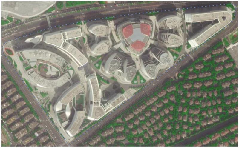 上海西虹橋1號能源站于2018年年初建成并投產(chǎn)。目前,該能源站為其規(guī)劃區(qū)域內(nèi)占地面積約為160 hm2的大型建筑群供能。該項(xiàng)目是集商業(yè)、餐飲、辦公于一體的大型城市綜合體,其中包括了辦公、集中商業(yè)、街區(qū)商業(yè)等在內(nèi)的多棟單體建筑,功能綜合性較強(qiáng),建筑群衛(wèi)星圖如圖1所示。
