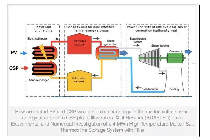 在這兩種情況下,提供電力的其余基礎(chǔ)設(shè)施——蒸汽輪機(jī)和發(fā)電機(jī)、變壓器、輸電線路和變電站原本已經(jīng)存在,只需要添加帶有電加熱器、熔鹽熱交換器等設(shè)備的儲罐即可。