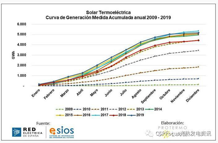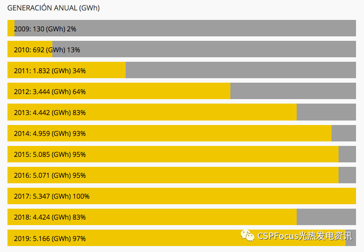 西班牙2009-2019十年間光熱發(fā)電項目年度累計發(fā)電量統(tǒng)計表