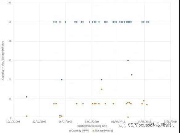 *藍(lán)點表示裝機容量,大多為50MW;黃點表示儲熱時長,大多為7小時