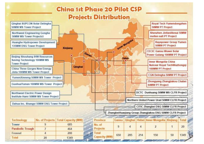 按照計劃,首批20個示范項目原則上均應(yīng)在2018年底前建成投產(chǎn)。然而,只有3個項目于2018年底前并網(wǎng),3個項目于2019年底前并網(wǎng),我國大型商業(yè)化光熱電站累計裝機容量350MW。目前,還有2個項目即將投運,裝機容量共計150MW。其余項目,有4個退出,有8個因資金等問題停止建設(shè)或尚未開工。有實質(zhì)進展的8個示范項目裝機容量僅500MW,與當初1.349GW的發(fā)展目標相去甚遠。