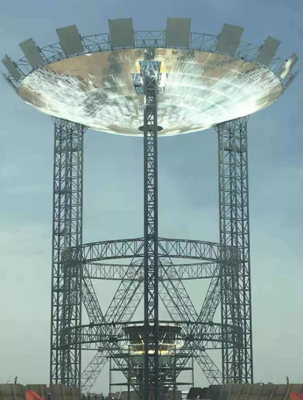 項(xiàng)目實(shí)施方針對(duì)傳統(tǒng)的塔式系統(tǒng)存在的缺點(diǎn),進(jìn)行了創(chuàng)新型的改進(jìn),運(yùn)用二次反射塔將吸熱器從塔頂移到了塔底,與傳統(tǒng)塔式光熱技術(shù)相比優(yōu)勢(shì)明顯。一是徹底清除了相關(guān)技術(shù)和工藝方面的風(fēng)險(xiǎn),從根源上降低了塔式熔鹽吸熱器的設(shè)計(jì)和建造難度。二是采用地面布置吸熱器,有效減少了熔鹽系統(tǒng)運(yùn)營(yíng)期間的安全性風(fēng)險(xiǎn)。三是降低吸熱系統(tǒng)成本,不僅可以進(jìn)行分期建設(shè),還能實(shí)現(xiàn)單個(gè)模塊的分批調(diào)試,獲得的參數(shù)可以直接應(yīng)用到后續(xù)模塊上。
