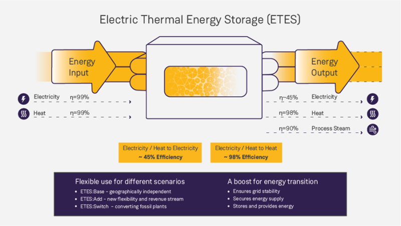 儲熱設施包括約1,000噸火山巖,用作儲存介質(zhì)。巖石被供給電能,然后通過電阻加熱器和風機將其轉(zhuǎn)換成熱空氣,然后將巖石加熱到750°C / 1382°F。當需求需要儲存的能量時,ETES使用蒸汽輪機對儲存的能量進行再次電氣化并將其反饋回電網(wǎng)。