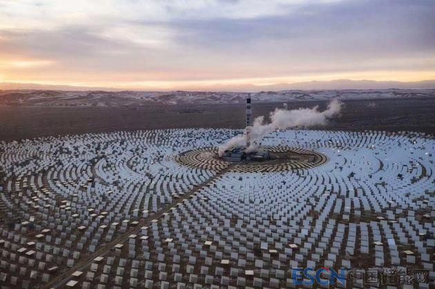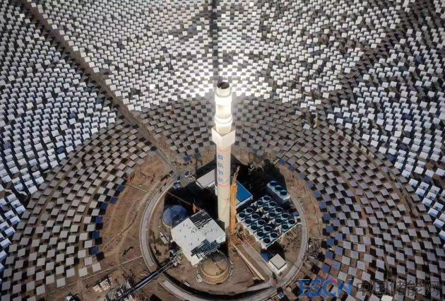 航拍光熱發(fā)電站——鏡場由12000多臺定日鏡組成,圍繞著高達260米的吸熱塔,總采光面積達140萬平方米