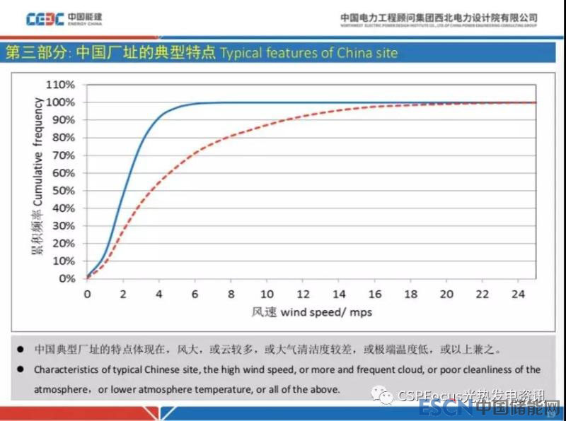 最后再強調一下風的問題,風大的話集熱器設計成本比較高,比如上面這一組曲線,橫坐標是風速,縱坐標是風速累積頻率結果,兩個曲線代表兩個廠址。比如這個電站集熱器要確保99%的風速下都可以工作,如果是紅色間斷線代表的廠址,那么這個地區(qū)風比較大,會發(fā)現集熱器抗風要求比較高,可能到15m/s或者更高,這里的風速是10米高的平均風速,跟外國常說的3s陣風的不太一樣,這里有個既定的轉化關系。而對于藍色實線代表的廠址,累積概率99%時對應的風大部分情況下都是6m/s以內,集熱器前期投資可以控制在比較低的水平。