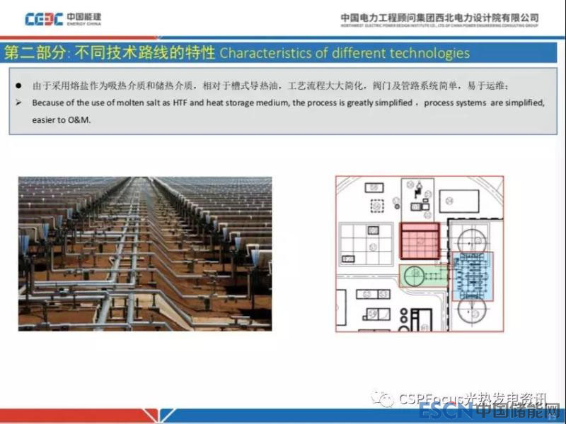 這是典型槽式電站的全廠管道工藝照片。想象一下50兆瓦槽式電站集熱管就需要120公里。塔式電站工藝系統(tǒng),包括發(fā)電、水、油鹽等系統(tǒng),布置比較緊湊,主要集中在儲換熱單元,還有儲換熱單元和發(fā)電單元連接之間的管架,以及吸熱塔,這一區(qū)域直徑范圍不過100米左右而已,因此從這個角度來講塔式電站這一塊優(yōu)越性表現良好。同樣的,前面提到槽式熔鹽電站,一個50MW的電站,管道太長,運行階段的防凝成本較高,同時高溫熔鹽管道一般采用奧氏體不銹鋼,這部分投資可能要到上千萬元。