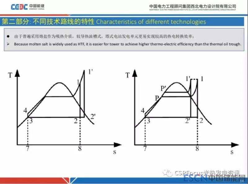 不同技術路線的特性,剛才談了前面光到熱環(huán)節(jié),后面熱到電的環(huán)節(jié)大家都比較清楚。由于普遍采用熔鹽作為吸熱介質,相比較槽式導熱油電站,塔式電站發(fā)電單元更容易實現較高的熱電轉換效率,這是一個典型的朗肯循環(huán)的圖,溫熵圖上面這段曲線右上角的點1和1’越高,做功介質平均吸熱溫度越高,朗肯循環(huán)效率越高,這個很簡單很成熟。同樣的道理,壓力越高右邊這張圖P和P’越高,一樣可實現較高的熱電效率。