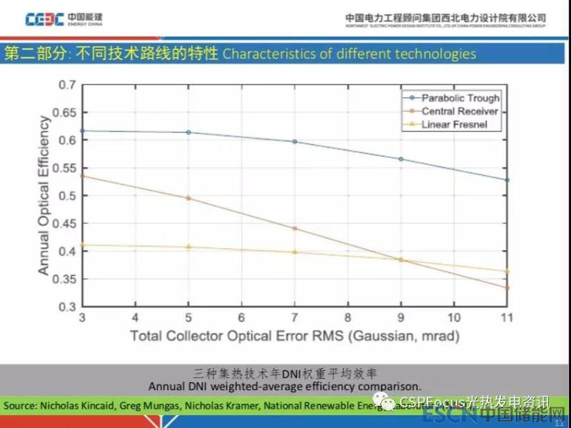 考慮這些因素以后,結合集熱場和定日鏡的誤差,包括跟蹤、反射鏡面型等,就有上面這組曲線。這組曲線藍線是槽式的,下降比較陡的是塔式,最下面的是菲涅爾。隨著誤差的增大,菲涅爾電站的總效率影響比較平緩,槽式次之,塔式最明顯。這就告訴我們,塔式電站定日鏡的設計效率偏離設計值的時候,可能給你的集熱場全年表現帶來非常糟糕的影響。也就是說菲涅爾電站的光學性能容錯能力比較強,通俗講技術難度比較低,現在要搞這個集熱器開發(fā),可能從菲涅爾入手比較簡單。塔式電站屬于精致活,主要是定日鏡,實際表現如果比較差的時候,可能這個電站就比較糟糕了,也有解救措施,大量增加定日鏡,這就要錢了。這個在工程應用中很重要,關鍵設備都要考慮萬一的情況。