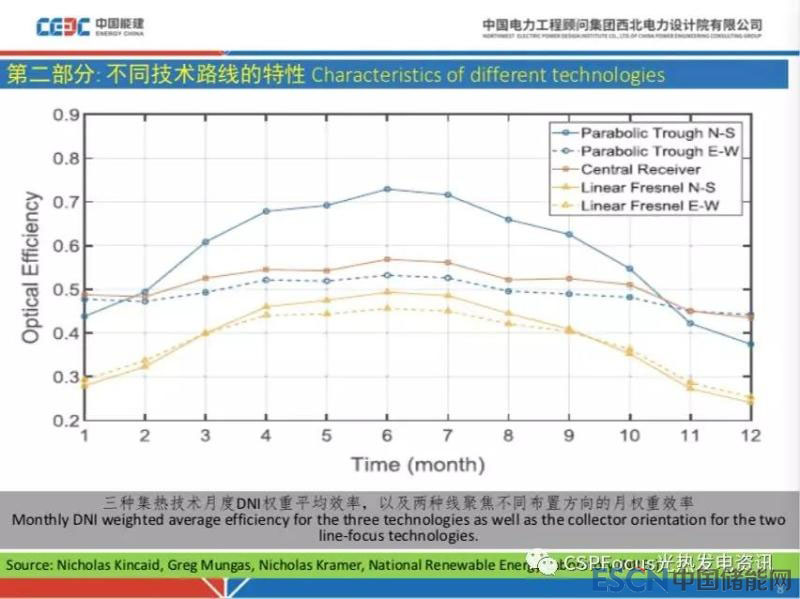 這就告訴我們,在一定緯度區(qū)域,從光學效率環(huán)節(jié)上講槽式電站有一定的優(yōu)勢,請記住,和緯度有一定的關系。槽式電站東西向布置和塔式電站效率表現類似,比較平穩(wěn),表現這兩根線隨月度變化沒有明顯的坡度。