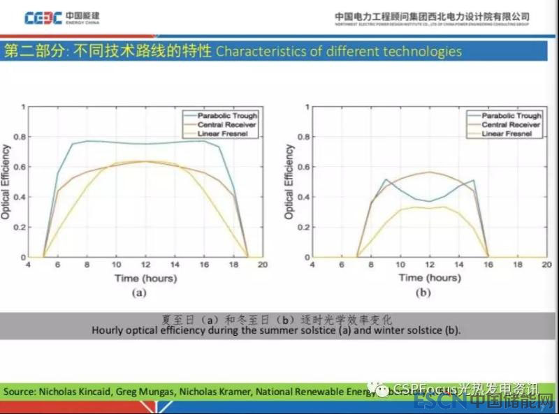 首先,上一組圖橫坐標是某一天時刻數,縱坐標是不同技術路線光學效率,左邊的圖是夏至日曲線,右邊的圖是冬至日曲線,藍色是槽式,中間橙色是塔式,黃色是菲涅爾。這組曲線地理位置在北緯36度,跟西安差不多的地方,夏季槽式電站光到熱是很關鍵的步驟,由圖可見,槽式具有比較明顯的更為優(yōu)越的光學效率,相應的塔式電站低一些,菲涅爾一天當中隨著時間推移效率變化是比較明顯的,就是表現為曲線的峰在時間維度比較窄,不像槽式和塔式很快可以達到較高效率,且能維持在較高效率環(huán)節(jié)較長時間。