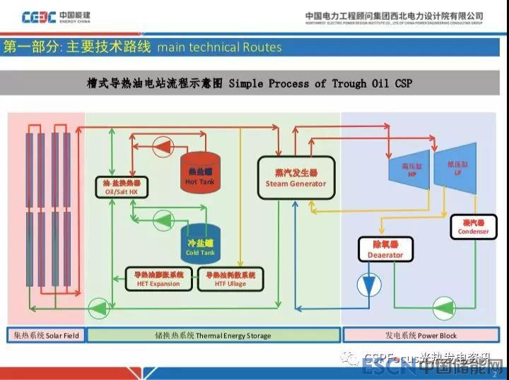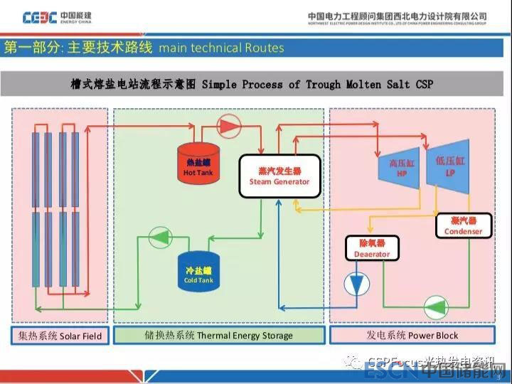 最為成熟的槽式導熱油帶儲熱電站,集熱場加熱后的導熱油溫度不是很高。大概290度導熱油進集熱場之后經過集熱器加熱到大概390度,首先優(yōu)先進入到蒸汽發(fā)生器和水換熱產生蒸汽,驅動汽輪機發(fā)電。當集熱場產生的熱功率大于汽輪機所需要的功率時候,多余的能量進儲換熱單元的油鹽換熱器,存儲在熔鹽中。熔鹽儲熱的時候冷的熔鹽通過低溫熔鹽泵循環(huán)吸熱,存儲在熱鹽罐里面,當夜間的時候熱熔鹽通過高溫熔鹽泵,在同樣一個換熱器里面將熱量傳給導熱油,導熱油再把熱量傳輸給蒸汽發(fā)生器里面的水,以產生蒸汽來發(fā)電。