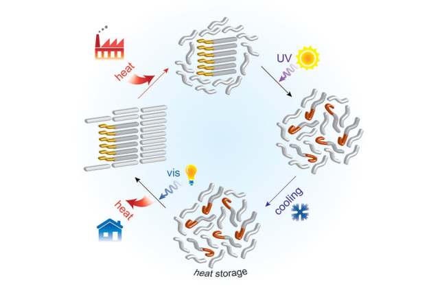 這種混合材料加熱即液化,但當其暴露在紫外線下時,即使再次冷卻下來,也還能維持液態(tài)。這種材料的大部分熱能,都能以每克200焦耳的量存儲起來,這在有機相變材料中,算儲存能力較強的。而當其暴露在另一種光線下時,就會固化,釋放熱能。