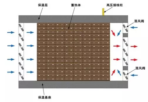 (2)固體儲(chǔ)熱一般采用金屬氧化物作為儲(chǔ)熱介質(zhì),如高密度鐵鎂金屬氧化物材料,儲(chǔ)熱溫度最高可達(dá)800℃,利用空氣作為換熱介質(zhì),由變頻風(fēng)扇驅(qū)動(dòng)空氣進(jìn)行熱量循環(huán)和交換,固體儲(chǔ)熱示意圖如圖3所示。固體儲(chǔ)熱溫度高,儲(chǔ)能密度較大,對(duì)外輸出熱能的形式多樣,既可以提供最高溫度400℃的熱風(fēng),也能夠提供300℃以下的熱油,還可以提供高溫蒸汽和熱水,因此能夠滿(mǎn)足工業(yè)和民用多個(gè)領(lǐng)域的用熱需求。
