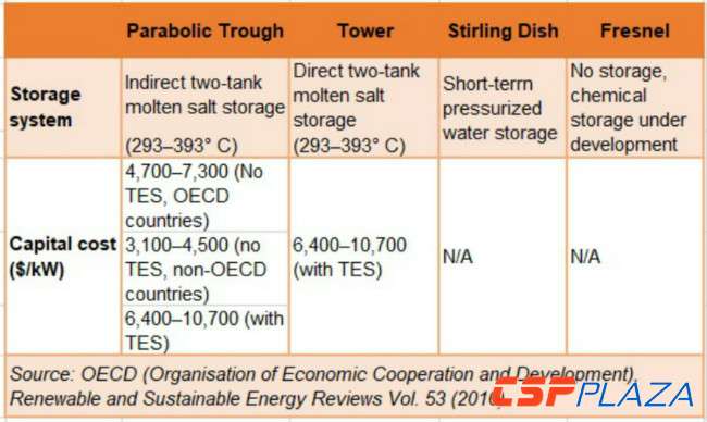 在每個(gè)電站中,由于儲(chǔ)能系統(tǒng)選用的技術(shù)類型和匹配容量的不同,其在光熱電站總成本中所占比例約為10%~20%。據(jù)國(guó)際可再生能源署IRENA發(fā)布數(shù)據(jù)顯示,隨著儲(chǔ)能溫度的逐步提高,儲(chǔ)能系統(tǒng)的設(shè)計(jì)不斷優(yōu)化,到2025年,拋物線槽式電站的儲(chǔ)能成本可降低38%,約26美元/kWhth;而塔式電站的儲(chǔ)熱成本則可降低17%,達(dá)到22美元/kWhth。美國(guó)能源部SunShot Initiative計(jì)劃的既定目標(biāo)是到2020年將儲(chǔ)能成本降至15美元/kWhth,有研究人員認(rèn)為,以目前的進(jìn)度可以預(yù)測(cè),儲(chǔ)能部分的成本下降速度將會(huì)超出計(jì)劃預(yù)期。