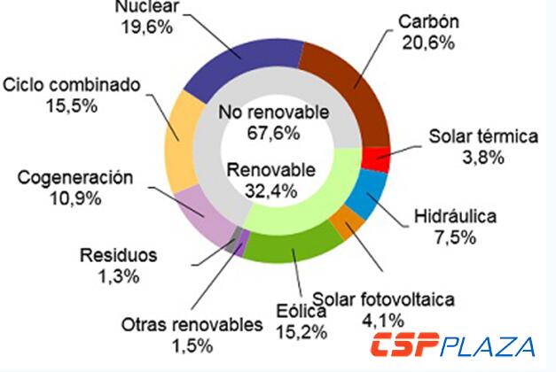 據(jù)西班牙有關部門發(fā)布的各類能源7月份發(fā)電量占比結(jié)果顯示,核能、煤炭、聯(lián)合循環(huán)、風電分別占比20.6%、18.8%、17.8%和15.5%;熱電聯(lián)產(chǎn)、水力發(fā)電、光伏發(fā)電、廢料發(fā)電則分別占比10.8%、5.3%、4.2%與1.3%,其它可再生能源占比1.6%。其中,可再生能源發(fā)電量占比達31%,51.3%的發(fā)電量來自不排放二氧化碳的發(fā)電技術。