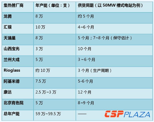 據(jù)CSPPLAZA記者了解,當(dāng)前各主要集熱管廠商的產(chǎn)能情況分別為(以下數(shù)據(jù)由對(duì)應(yīng)廠商提供,未經(jīng)實(shí)地調(diào)研):