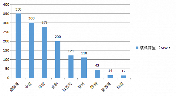 各國(guó)在建太陽(yáng)能光熱發(fā)電站裝機(jī)容量(截至2016年2月),數(shù)據(jù)來(lái)源:SolarPACES