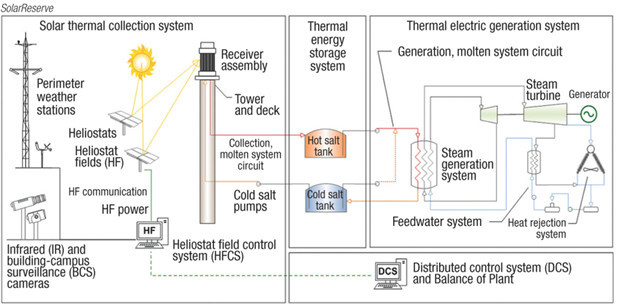 另一美國知名光熱電站開發(fā)商SolarReserve的首席執(zhí)行官Kevin Smith認(rèn)為,光熱電站的主要優(yōu)勢在于它可以生產(chǎn)出電網(wǎng)友好型的可調(diào)度電力。這意味著與傳統(tǒng)的發(fā)電廠一樣,光熱電站產(chǎn)生的電力可以很好地滿足連續(xù)的用電需求,而這主要得益于光熱電站可以配置高性價比的熔鹽儲熱系統(tǒng)。這種儲熱技術(shù)并非直接蓄電(光伏和風(fēng)電一般使用蓄電池來儲存電力),這使得光熱電站生產(chǎn)的電力不僅可調(diào)度,而且可以實(shí)現(xiàn)24小時電力調(diào)度,且夜間不需要補(bǔ)充備用燃料。