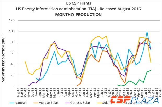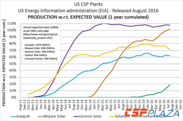 單純地從實(shí)際發(fā)電量與設(shè)計(jì)發(fā)電量的對(duì)比來看,槽式無儲(chǔ)熱電站的表現(xiàn)最佳,Genesis Solar在2015年全年的發(fā)電量達(dá)到621454MWh,達(dá)設(shè)計(jì)年發(fā)電量的107%;Solana電站在2015年全年的發(fā)電量達(dá)到718843MWh,達(dá)設(shè)計(jì)年發(fā)電量的76%;Ivanpah電站2015年度總發(fā)電量達(dá)到670467MWh,達(dá)設(shè)計(jì)年發(fā)電量的62%。這三大電站的投運(yùn)時(shí)間相近,排除各自需要的學(xué)習(xí)過渡期的因素影響,槽式無儲(chǔ)熱電站看起來更易達(dá)到設(shè)計(jì)發(fā)電目標(biāo)。