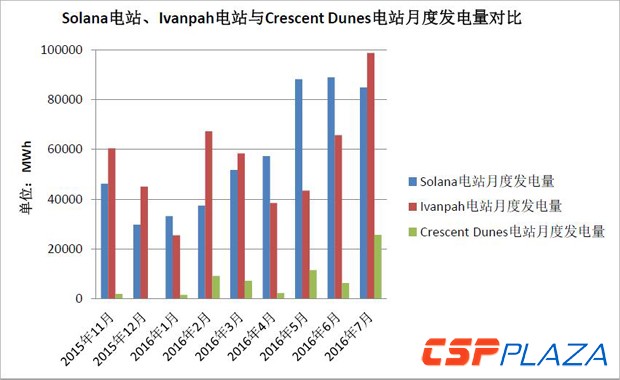 對中國市場而言,其中尤為值得關注的是Ivanpah、Solana和CrescentDunes三個項目,Ivanpah電站的開發(fā)商BrightSource的技術將應用于國電投黃河公司135MW塔式示范電站,Solana電站則是大型槽式帶儲能電站的樣本,CrescentDunes電站更是大型熔鹽塔式電站的標桿工程。在此前CSPPLAZA的文章里(見相關閱讀),已經(jīng)對Ivanpah和Solana兩大項目自2014年1月到2015年11月的發(fā)電量進行了對比分析,鑒于新月沙丘電站于今年2月份才宣告正式投運,至今該電站的實際投運時間已超過半年,我們結(jié)合這三個電站的發(fā)電量情況再作一簡單對比。