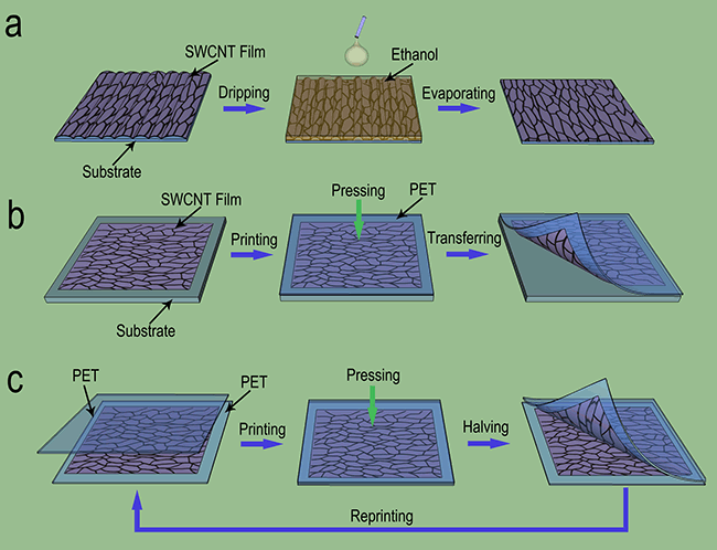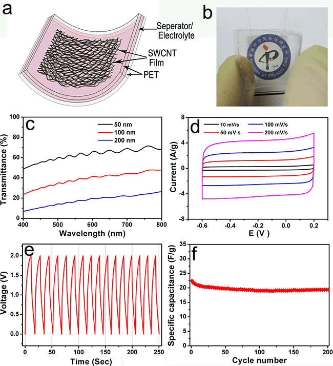 碳納米管透明薄膜是替代氧化銦錫(ITO)導電薄膜的理想材料,更重要的是有望廣泛地應用于柔性電子器件。利用浮動催化法直接制備的自支撐碳納米管薄膜具有獨特的二維連續(xù)網(wǎng)絡結構,從而具有優(yōu)異的電學和力學性能(Nano. Lett. 2007, 7, 2307)。但是由于受其制備條件的約束,小于100 納米的自支撐透明導電薄膜難以利用此方法直接來獲得,這限制了其進一步的應用。為了解決這一問題,他們發(fā)展了傳統(tǒng)的轉移印刷技術,提出了一種基于靜電吸附的減薄碳納米管薄膜的方法——重復轉移印刷法,通過利用離子靜電吸附效應提高低表面能基底的表面能,使得碳納米管薄膜可以從高表面能的基底轉移到原本表面能較低的基底上。結合具有特殊二維網(wǎng)絡結構的碳納米管薄膜與靜電吸附重復轉移印刷法,可在PET襯底上得到不同厚度甚至近于亞單層的超薄碳納米管薄膜,透明度可達90%以上。此方法不僅可以有效提高碳納米管的利用率,保持碳納米管薄膜的結構,還可以有效提高超薄碳納米管薄膜的制備效率,簡化了實驗過程。該方法正在申請中國發(fā)明專利(201210270061.0)?;谒苽涞某√技{米管薄膜,研究人員組裝了柔性透明碳納米管薄膜超級電容器,超級電容器表現(xiàn)出了一定的透光性和良好的電化學性能。相關研究結果發(fā)表在Small (DOI: 10.1002/smll.201201587)上,并得到編輯的較高評價。