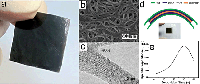 碳納米管薄膜具有高導電性和多孔結構,可以直接作為超級電容器的電極材料,但是由于碳納米管薄膜中的碳納米管一般是以管束的形式存在,管束內(nèi)部空隙尺寸在0.4 nm以下,電解液離子根本無法進入管束內(nèi)部的空隙,因此管束內(nèi)部碳納米管的表面對雙電層電容沒有貢獻,致使其有效比表面積大大減小,比電容較小。在碳納米管表面包覆導電聚合物,引進贗電容是提高碳納米管電極比電容的一種有效途徑。但是低電導率導電聚合物的加入導致碳納米管/導電聚合物異質(zhì)結構電極的導電率與碳納米管相比會嚴重下降,影響超級電容器的功率密度。如何在利用導電聚合物提高能量密度的同時不降低超級電容器功率密度,是目前碳納米管/導電聚合物異質(zhì)電極制備的一個難題。他們以直接生長的自支撐碳納米管薄膜作為模板,利用電沉積的方法成功制備出了“骨架/皮膚”型的碳納米管/聚苯胺異質(zhì)結構薄膜。在這種異質(zhì)結構薄膜中,聚苯胺均勻包覆碳納米管薄膜中的碳管管束,碳管管束仍然保持良好的連續(xù)網(wǎng)絡結構,形成新的“骨架/皮膚”型碳納米管/聚苯胺異質(zhì)連續(xù)網(wǎng)格結構,確保異質(zhì)結構薄膜具有高導電性。此結構既充分發(fā)揮了碳納米管的高導電性,又發(fā)揮了導電聚合物贗電容的優(yōu)勢。獨立無支撐的碳納米管/聚苯胺異質(zhì)結構薄膜具有非常好的力學性質(zhì),可以作為柔性超級電容器電極。與直接生長的碳納米管薄膜電極相比,基于碳納米管/聚苯胺異質(zhì)結構薄膜的超級電容器電極的比電容提高了近一個數(shù)量級,并且在提高電極電流密度的同時,也保證其具有較高的功率密度。相關研究結果發(fā)表在Energy & Environmental Science(2012, 5, 8726)上,被編輯部選為Hot Paper進行了介紹,Chemistry World也以Skeleton and skin strategy improves supercapacitor為題進行了專門報道。