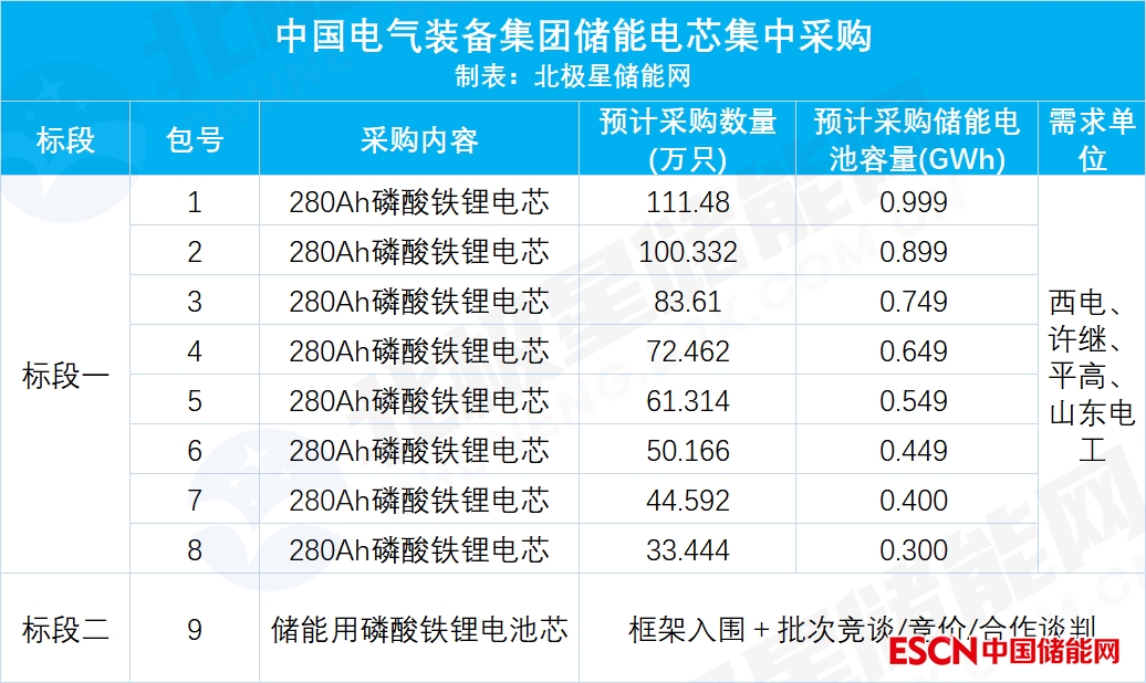 中國電氣裝備集團發(fā)布儲能電芯規(guī)模集采公告,需求單位來自西電、許繼、平高、山東電工。本次采購共包含兩個標(biāo)段,其中標(biāo)段一有8個標(biāo)包,預(yù)計共采購557.4萬只280Ah磷酸鐵鋰電芯,總儲能電池容量預(yù)計達(dá)4.99GWh。標(biāo)段二則同樣采購儲能用磷酸鐵鋰電池芯、未透露具體采購規(guī)模,根據(jù)框架入圍+批次競談/競價/合作談判的形式確定。