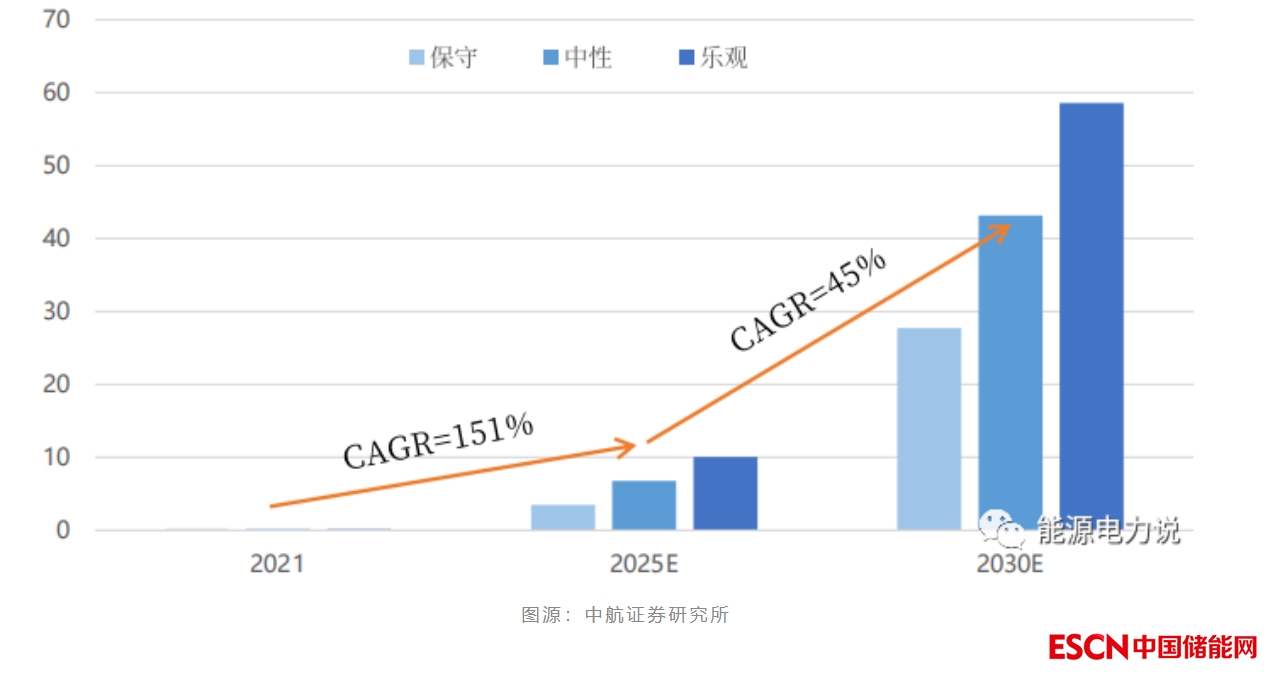 蓄熱式壓縮空氣儲能系統(tǒng)在系統(tǒng)效率和技術(shù)成熟度上較為突出,而我國鹽洞和廢棄礦洞較多,已具大規(guī)模商業(yè)化條件。據(jù)統(tǒng)計,2022年我國壓縮空氣儲能項目容量超過6GW,且裝機容量均為100MW以上,備電時長達4-8小時。在中性預(yù)期下,到2025年,我國累計壓縮空氣儲能裝機量將達到6.76GW,CAGR為151%;而到2030年,預(yù)計有望達到43.15GW。