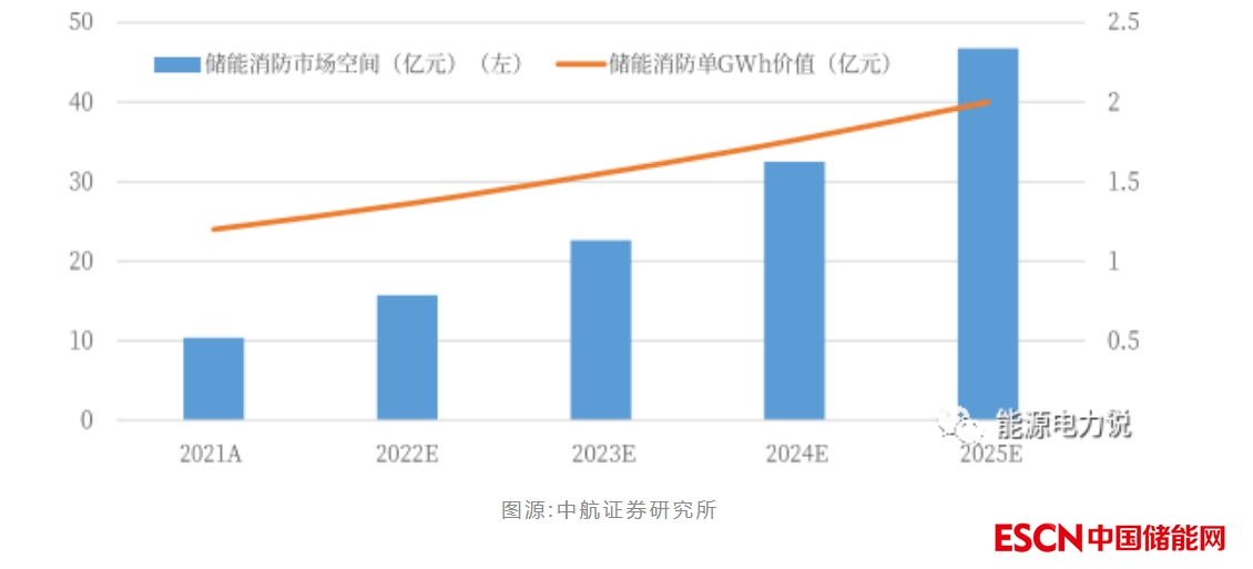毒性較低、滅火性較好的全氟己酮有望成為滅火介質(zhì)新趨勢。目前國內(nèi)儲能消防價值量占比約3%,預(yù)計到2025年國內(nèi)儲能消防市場空間有望達到46.75元,CAGR為45.7%。