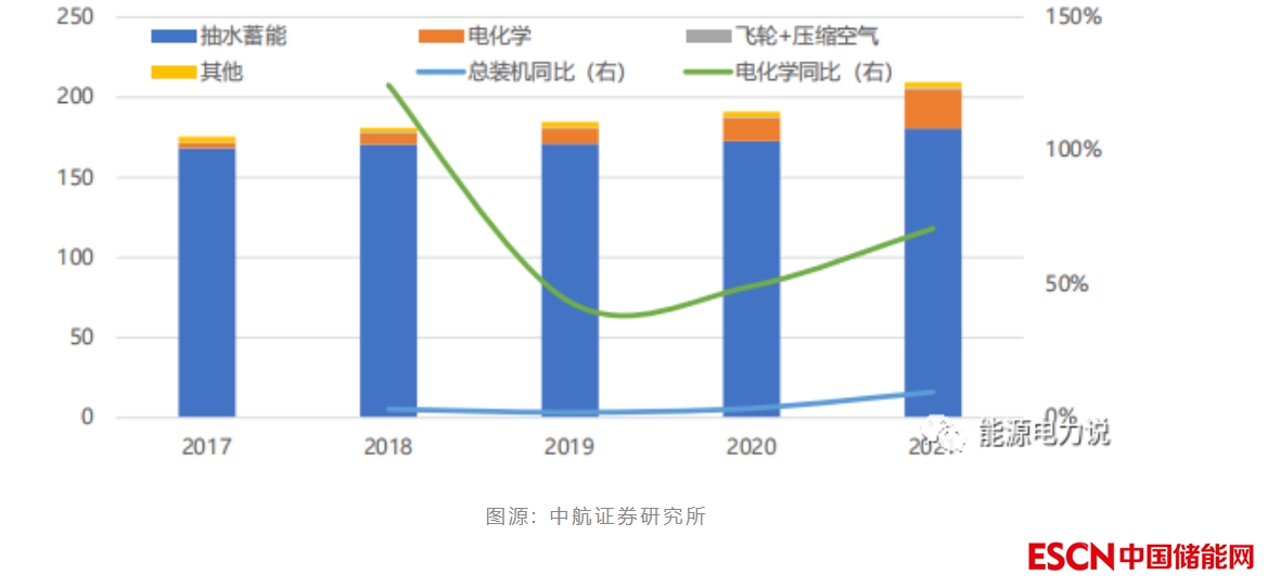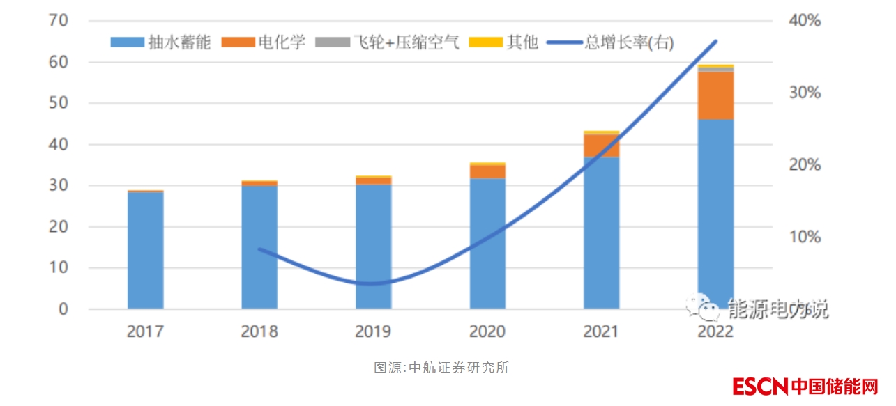 中國儲能裝機累計規(guī)模及增速