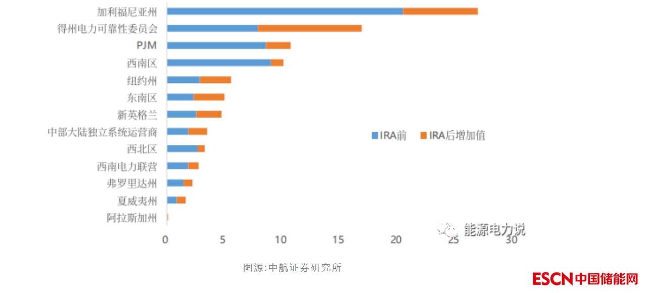 IRA法案推動美國各州2022-2030年裝機量增長(GW)