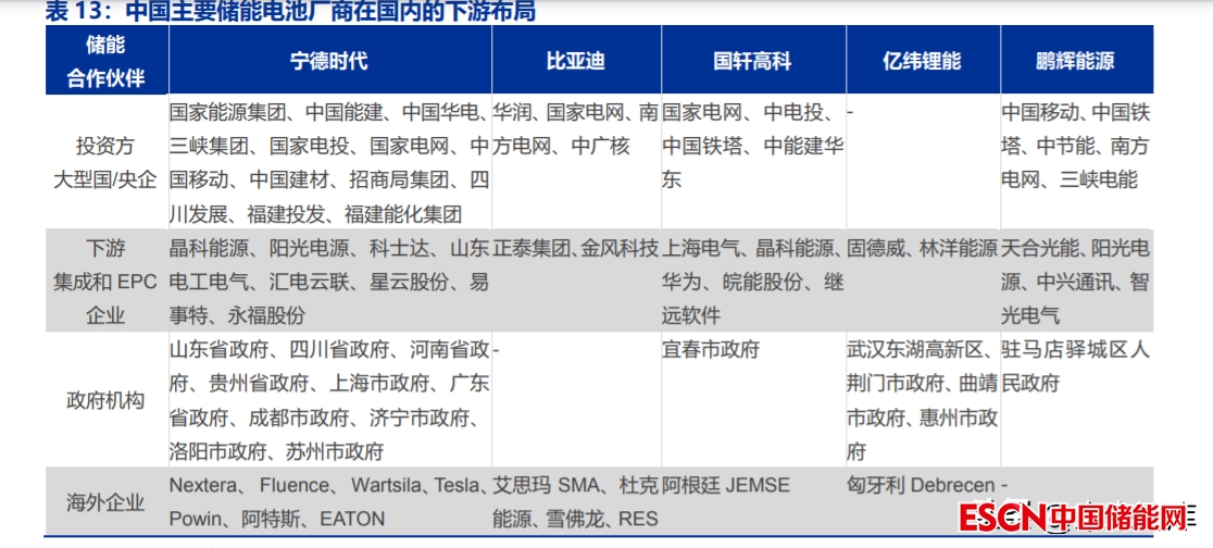 國內市場,中國儲能電池廠商正積極加快儲能下游布局。圍繞儲能產業(yè)鏈下游,以寧 德為首的儲能電芯廠商 19 年開始打造產業(yè)鏈閉環(huán),紛紛與政府、大型國企央企、產業(yè)鏈下 游和海外企業(yè)牢牢綁定,并開始延伸系統(tǒng)集成和項目開發(fā)。我們認為,隨著中國電力儲能 發(fā)展路線日漸清晰,具備下游合作資源的儲能電芯廠商有望在產業(yè)鏈合作中發(fā)揮更大價值。