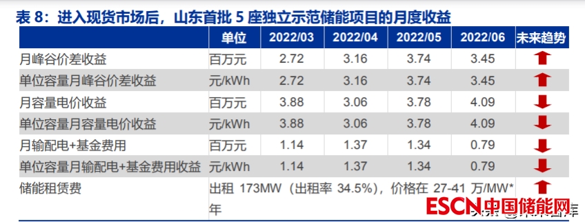 容量租賃增厚獨立儲能收益,山東和河南先后出臺支持儲能容量租賃的政策。22 年 8 月,河南發(fā)布《關于印發(fā)河南省“十四五”新型儲能實施方案的通知》,其中明確建立共 享儲能容量租賃制度,容量租賃參考價為 200 元/kWh*年,并支持簽訂 10 年以上的長期 租賃協(xié)議和合同。22 年 9 月,山東印發(fā)《關于促進我省新型儲能示范項目健康發(fā)展的若干 措施》,文件指出山東省電力交易中心將按月度組織撮合儲能容量租賃。容量租賃模式的 鼓勵政策逐步落地,配合各地強制配儲要求,獨立儲能容量租賃的收益空間將逐步打開。