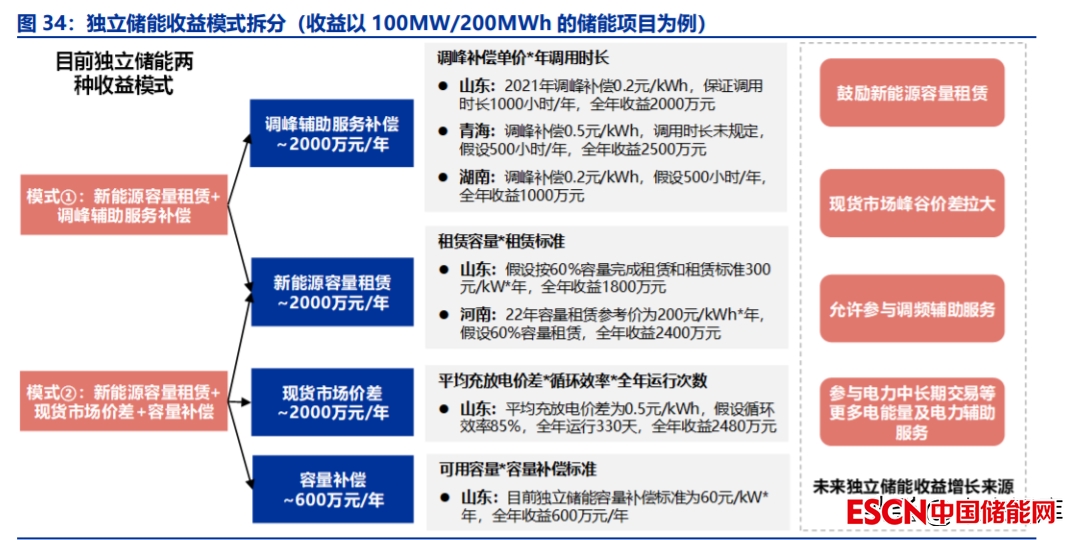 目前中國獨立儲能收益模式主要分為兩種。在電力現(xiàn)貨市場未建立地區(qū),青海、寧夏 和湖南等多個省市出臺了獨立儲能電站調峰補償標準。獨立儲能收益模式以調峰補償+容量 租賃為主。在山東等建立電力現(xiàn)貨市場的地區(qū),獨立儲能收益模式以現(xiàn)貨市場套利+容量租賃+容量補償為主。以 100MW/200MWh 的獨立儲能為例,目前獨立儲能兩種商業(yè)模式下, 穩(wěn)定的可預期收益每年可達到 4000 萬元以上。