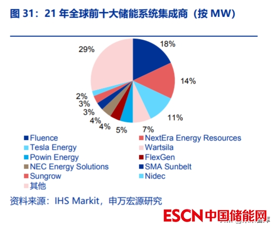 全球市場,中國儲能電芯廠商加速出海。2019-2020 年全球儲能以海外市場為主,三 星 SDI、LGC 和松下等品牌在海外耕耘多年,占據全球市場主要份額,2019-2020 年三者 合計全球市場份額分別達 73%/65%。日韓電池廠商在儲能主推三元電池技術,但三元儲能 產品近年起火事件陸續(xù)出現(xiàn),而磷酸鐵鋰安全性和經濟性在動力電池領域得到驗證。2021 年中國磷酸鐵鋰電池的優(yōu)勢改變全球儲能電池市場格局,以寧德時代為首的中國廠商后來 居上,2021 年全球市場份額快速提升。