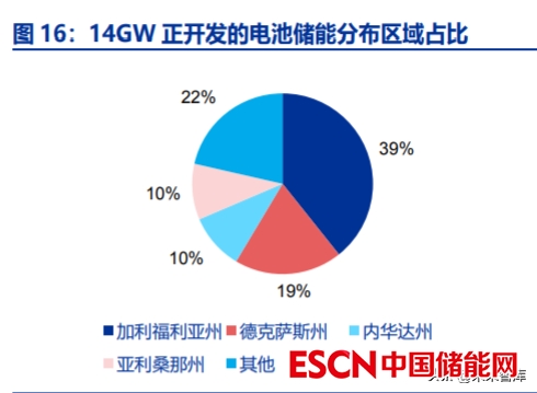 截止 3Q22,美國約有 14GW/37GWh 的儲能項目處于開發(fā)中。根據美國清潔能源協(xié) 會統(tǒng)計,截止 3Q22,美國正在開發(fā)的清潔電力項目共 132GW(相當于可支持 3400 萬美 國家庭的電力需求),其中光伏/陸風/海風/電池儲能分別占 59%/17%/13%/11%。美國 正在開發(fā)的 14GW/37GWh 儲能項目地區(qū)分布上,約 5.5GW 位于加利福尼亞州,超過 2.7GW 在德克薩斯州,內華達州和亞利桑那州均為 1.4GW 左右。