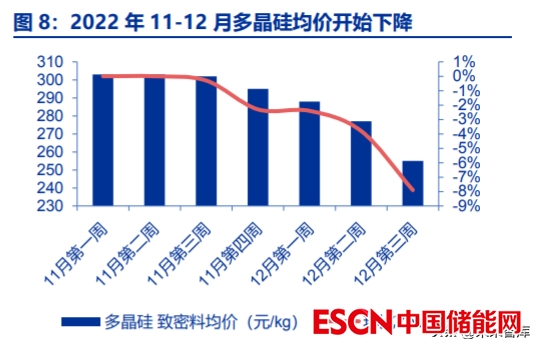 硅料產能釋放打開光伏裝機彈性。2022 年光伏終端需求增長旺盛,國內多晶硅現(xiàn)貨價 從年初的24萬元/噸漲至8 月的超30萬元/噸,預計2022年國內多晶硅供應量為92萬噸, 可支撐交流側裝機240-250GW,下游地面電站的裝機增長仍受制于硅料供應瓶頸和價格。 2023 年將迎硅料產能釋放大年,結合 Solarzoom 相關統(tǒng)計,全球硅料名義產能將從 22 年底的 128 萬噸增長至 23 年底的 240 萬噸,預計 23 年多晶硅全球供應量約為 147 萬 噸,可支撐超 400GW 的交流側裝機。23 年起硅料新增產能開始批量釋放,對應硅料價格 開啟下行通道,也為對組價價格敏感度較高的集中式電站項目的建設帶來了彈性。